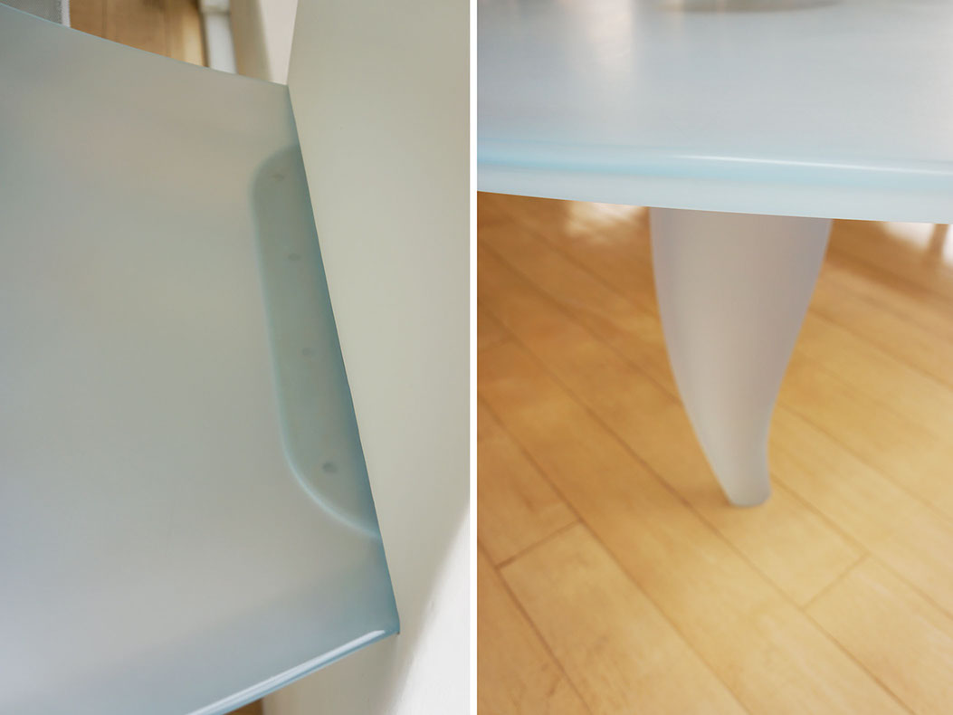 GMD designed and engineered cantilvered acrylic table with single sculptural leg. GMD devised custom finish to create colored acrylic and cast leg.