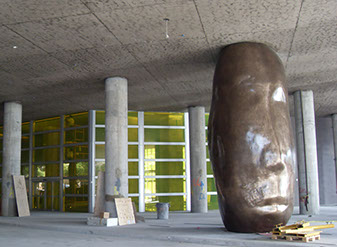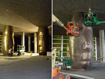 GMD laser scanned hand sculptured maquettes, cleaned and remodeled data as 27 foot enlargements of column covers for mixed use development. GMD took on-site as built drawings of site conditions in order to develop installation strategies and modify enlargements to meet architectural conditions. GMD developed robotic processes to facilitate composite fabrication of 97 column covers. Five two-part direct tools with mating flanges were produced to fabricate parts. Tooling was set up in cartridge like manner to allow for robotic gel coat spraying, automated chopper gun fiberglass application, and automated part trimming. Composite parts were metalized while in tooling with bronze, brass and steel metals. Specialized installation jigs were developed for on site installation. GMD coordinated with architects, design team, and contractors through shop drawings and performed on-site installation.