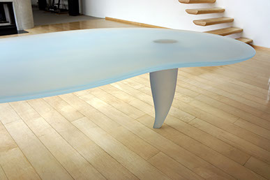 GMD designed and engineered cantilvered acrylic table with single sculptural leg. GMD devised custom finish to create colored acrylic and cast leg.