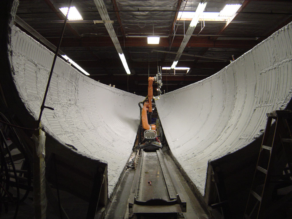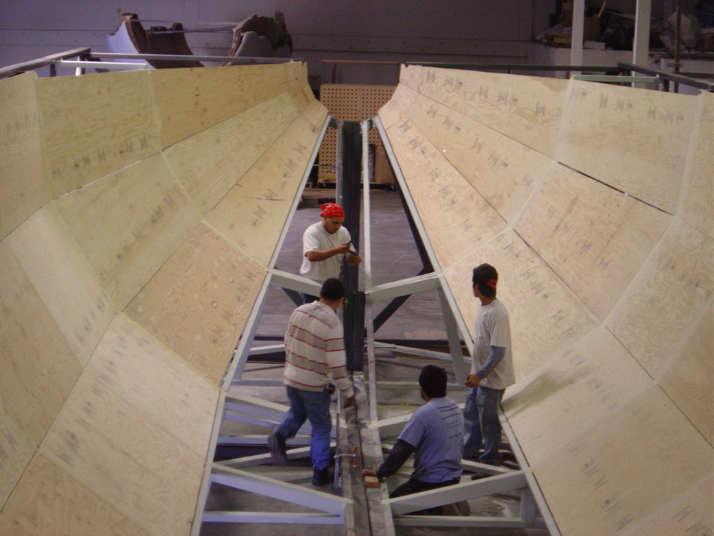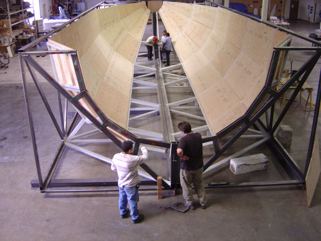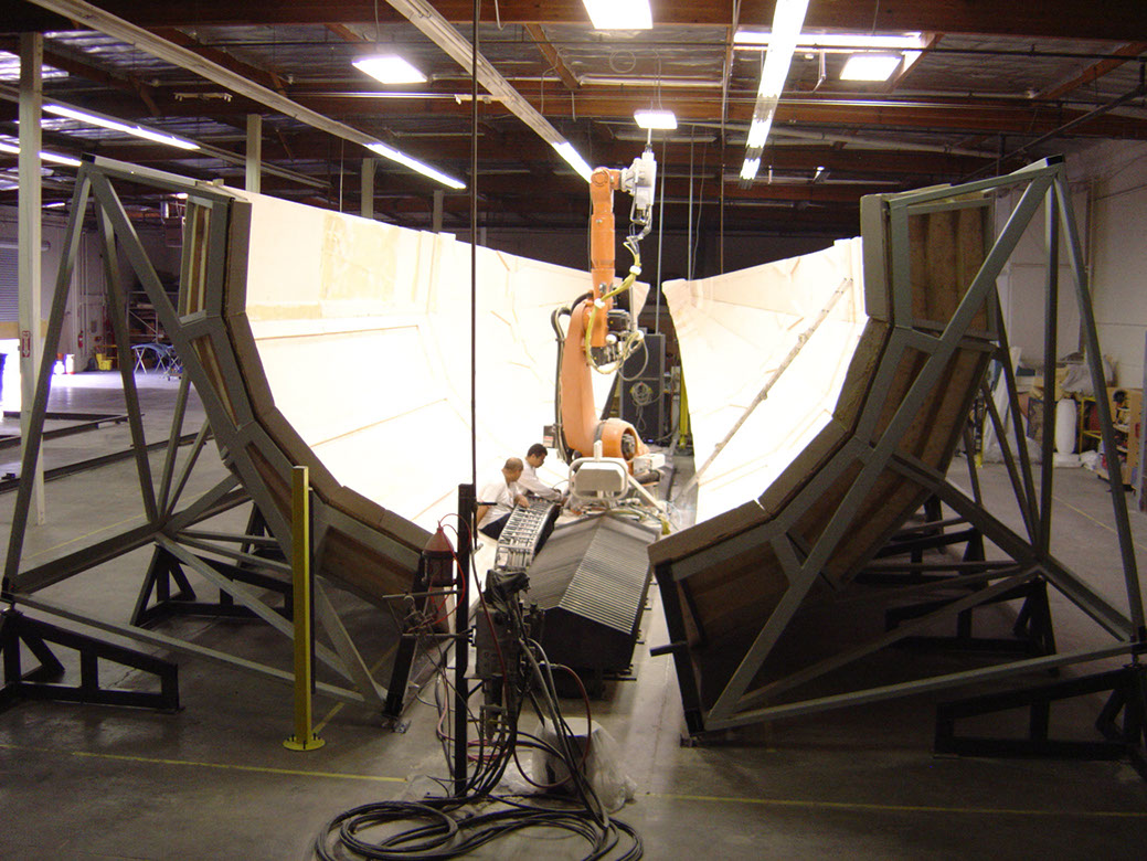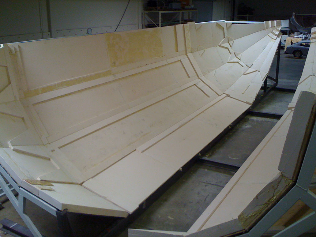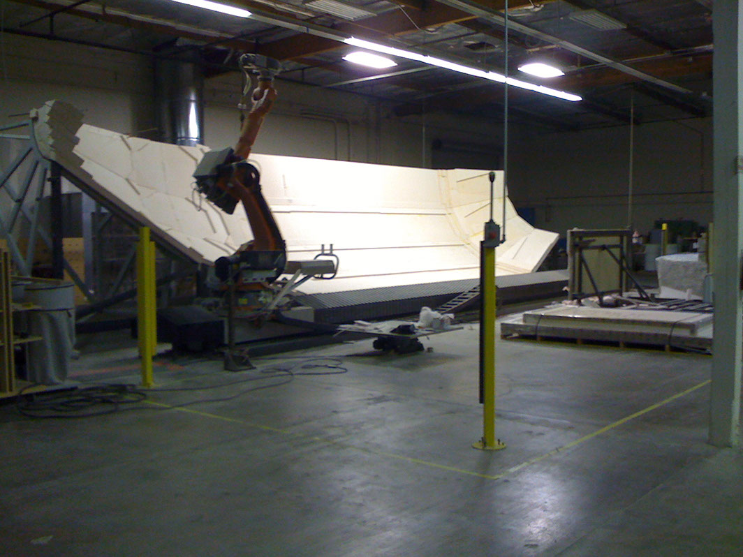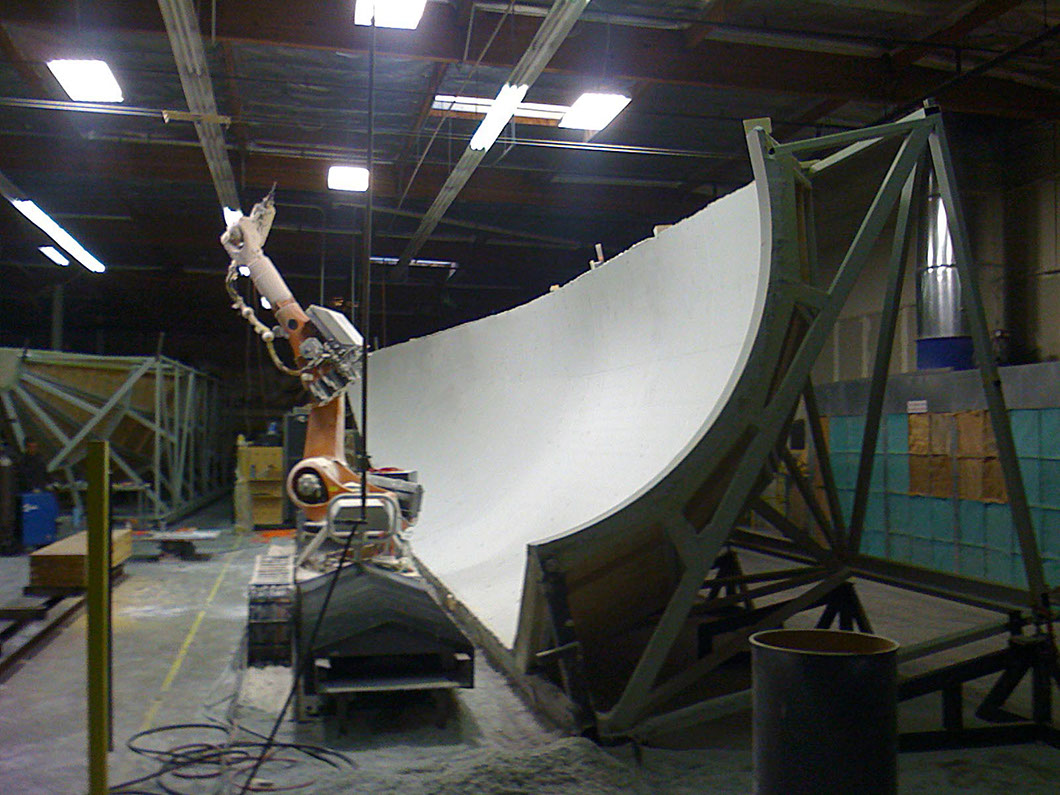Using client data for satellite payload fairing for Falcon Nine rocket launches, GMD developed trussed steel frame structure to support tooling paste for five axis milling of industrial direct tooling. Due to large milling envelope GMD was able to accomodate 47 foot long and 17 radius tooling frame.