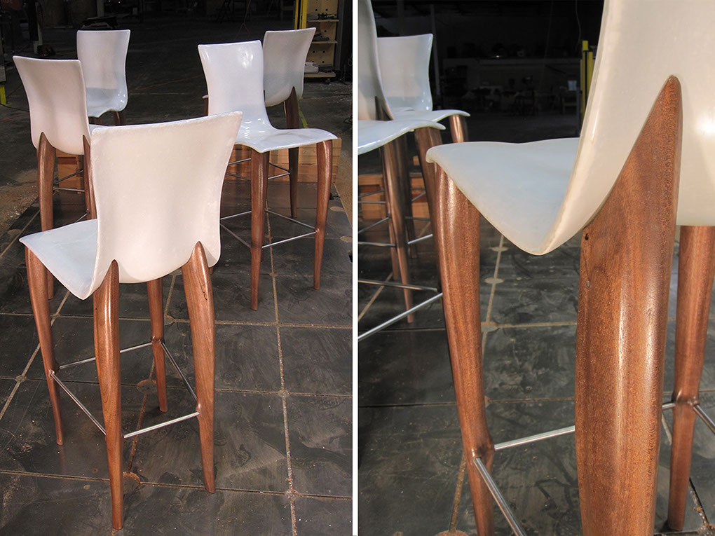 GMD designed feature furniture as seen in the Trois Mec barstool with sculpted mahogany legs and translucent fiberglass seat.
